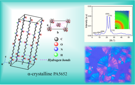 貴大新聞網(wǎng)訊(材料與冶金學(xué)院)近日,我校材料與冶金學(xué)院劉玉飛特聘教授團隊在生物基聚酰胺材料研究領(lǐng)域取得重要突破,相關(guān)成果以 Biobased Polyamide 5652 with α?Crystal Form: Characterization and Low Moisture Absorption為題,發(fā)表于高分子領(lǐng)域頂級期刊Macromolecules(自然指數(shù)期刊,中科院一區(qū)TOP)。貴州大學(xué)材料與冶金學(xué)院為論文第一完成單位,材料與冶金學(xué)院2022級碩士研究生王艷平為第一作者,劉玉飛特聘教授為通訊作者。近年來,生物基聚酰胺56(PA56)因其原料可再生、低碳環(huán)保而備受關(guān)注,但其特殊的分子結(jié)構(gòu)(戊二胺單元含奇數(shù)碳原子)導(dǎo)致其晶體通常以γ晶型為主,飽和吸水率高達12%以上,在潮濕環(huán)境中力學(xué)性能顯著下降(如拉伸強度降低20%-30%),嚴(yán)重限制了在精密工程領(lǐng)域的應(yīng)用,而傳統(tǒng)改性方法往往以犧牲材料其他性能為代價。針對這一難題,劉玉飛特聘教授創(chuàng)新性地提出了雙氫鍵結(jié)構(gòu)調(diào)控策略:自主合成關(guān)鍵單體,設(shè)計并成功合成新型565二胺單體(C16H34N4O2),將565二胺與草酸二丁酯通過溶液聚合及